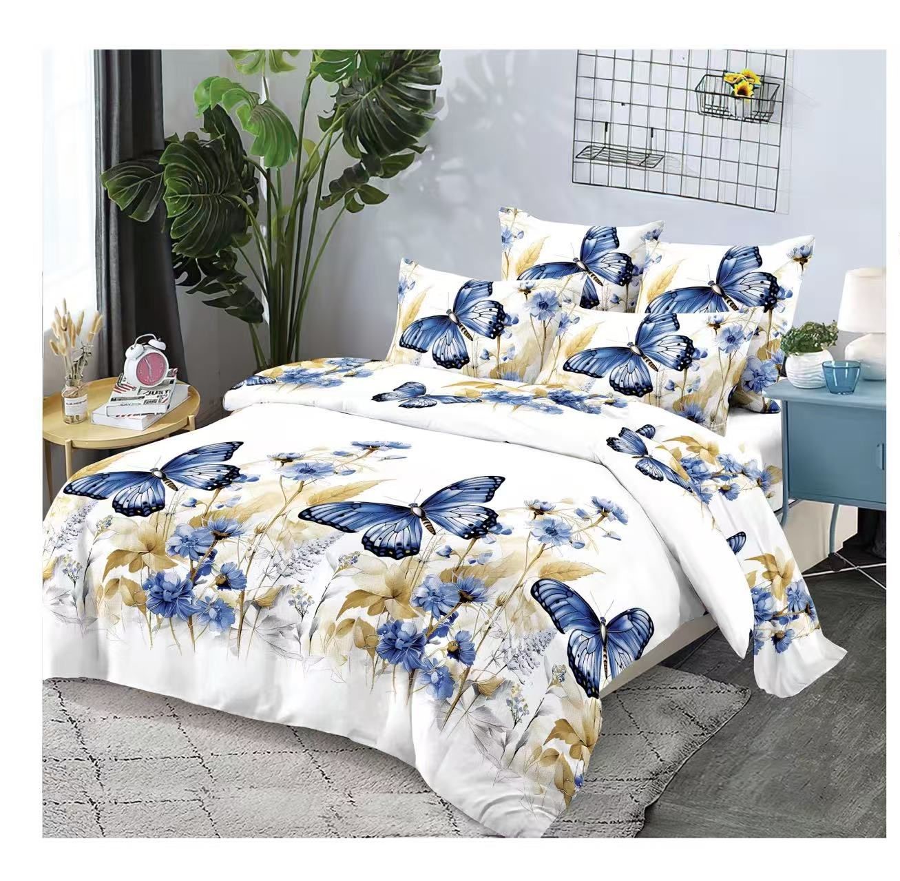 Set 6 piese, Lenjerie de pat Bumbac Finet, Fluturi Albastri